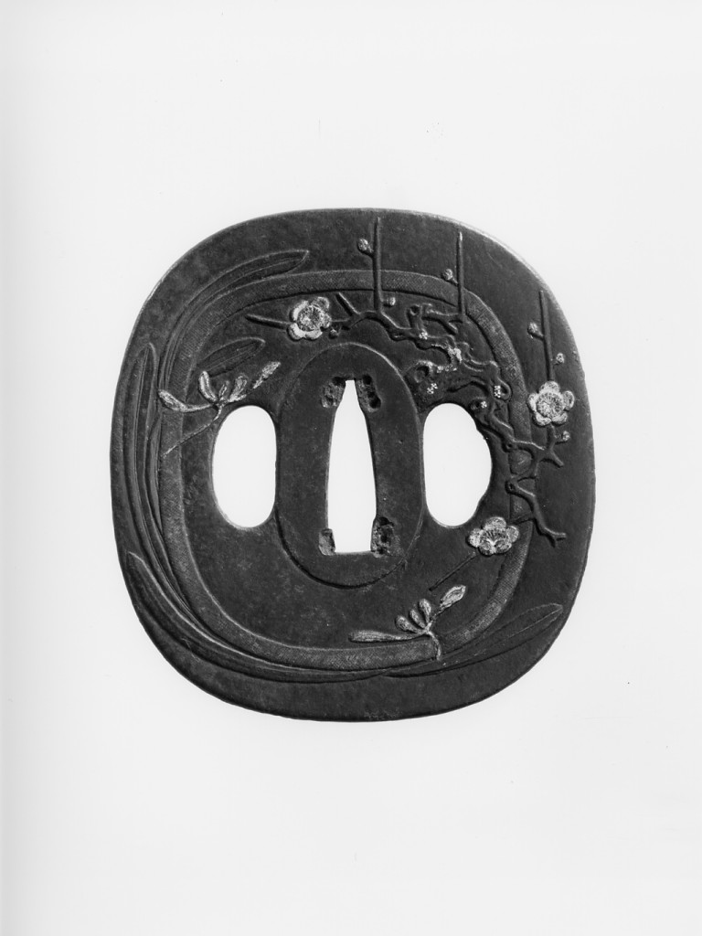 Tsuba quadrangolare ad angoli smussati fornita di due fori per coltellino e spillone raffigurante un albero di susino in fiore, foglie (recto), canna di bambù con foglie, due fiori e bocciolo di crisantemo (verso). L'oggetto è in acciaio brunito nero inciso a alto-basso rilievo, dorato e argentato a falsa agemina.
