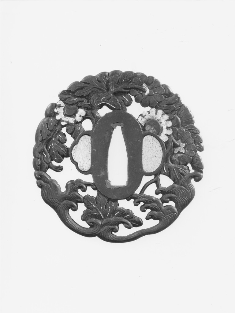 onde di acqua, fiori con foglie (recto-verso) (guradamano da sciabola - tsuba circolare irregolare)