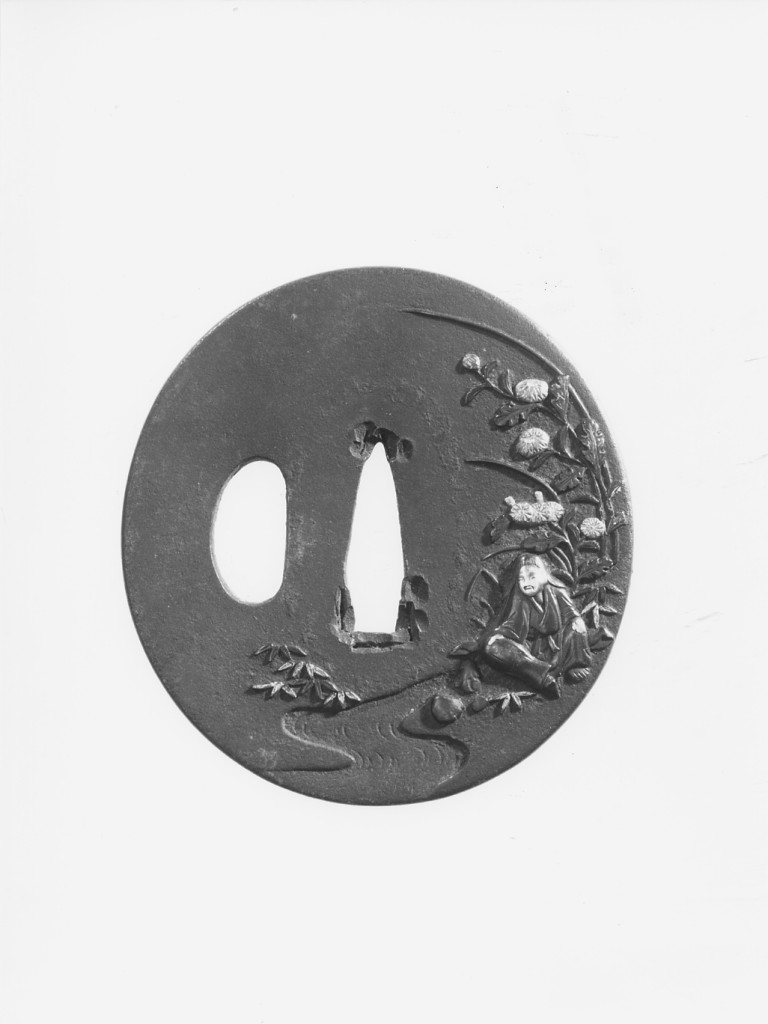 paesaggio con fiore, erba, uomo sotto dei fiori (recto)/ paesaggio con fiume, erbe, rocce (verso) (guradamano da sciabola)