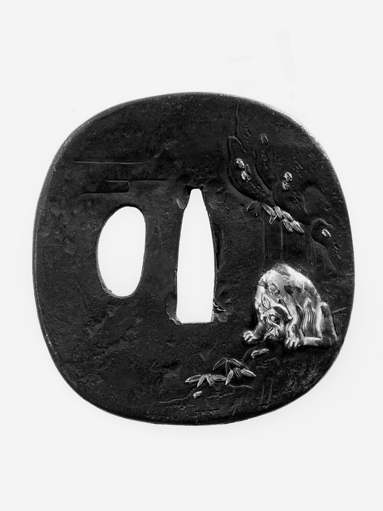 fiera con paesaggio di cascata e motivi vegetali (recto)/ roccia e vegetazione (verso) (guradamano da sciabola - tsuba squadrata ad angoli smussati)