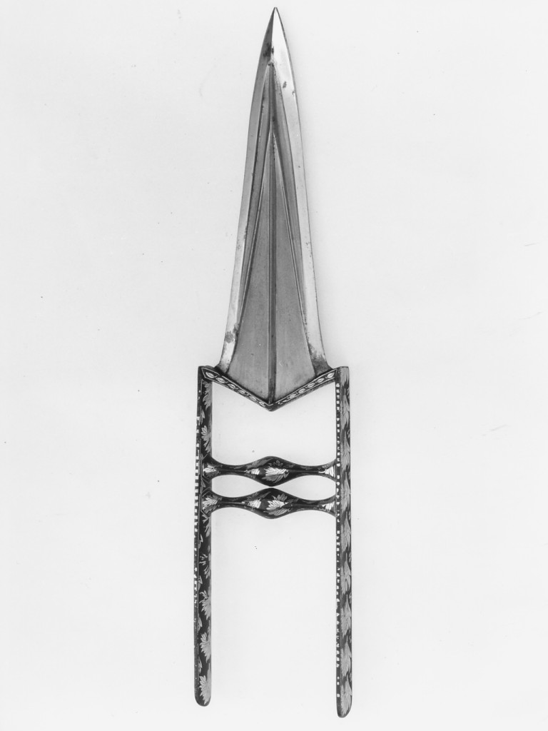 Maniglia a doppia sezione; lama con nervatura centrale e altre più piccole a scaglione.