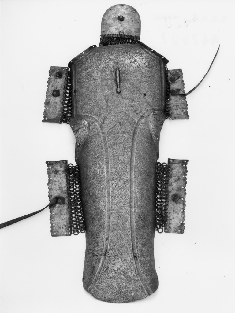 Scanalature profilate dal frontale al naso; superficie completamente decorata a fiorami. Maglia di ferro ad anelli a grano d'orzo.