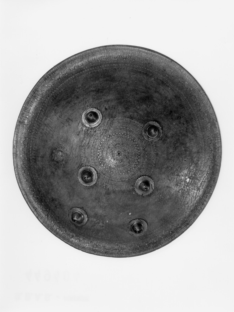 decorazione a greche perimetrale; rosone centrale a greche con motivi floreali; decorazione perimetrale interna; quattro rosoni isolati