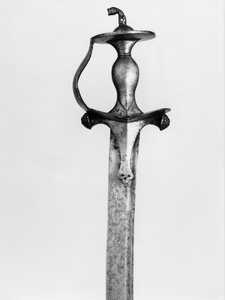 fornimento a cesto tipico indù. Guardia a controcurva. Bracci corti terminati a fiore. Pomo a disco con calottina terminata da protuberanza a testacanina. Impugnatura a balaustro. Lama scanalata vicino al dorso. Fodero di legno rivestito di pelle con bocca tagliata a scaglione rovescio. Lama europea probabilmente tedesca (XVII sec.)