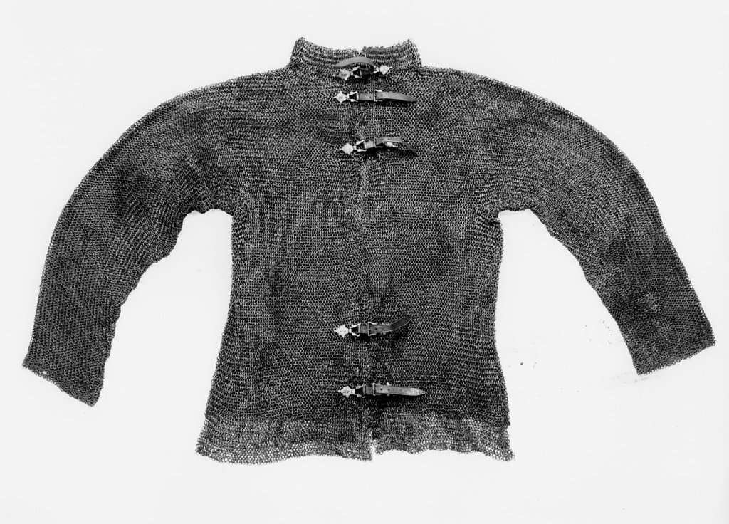 camicia aperta sul davanti, chiusa da cinque fibbie smerlate, di cui una sul collo alla coreana; maniche lunghe; bordo della maglia e maniche dorato; maglia di ferro a anelli a grano d'orzo e maglia di ottone a anelli fitti con ribattino ingrossato.