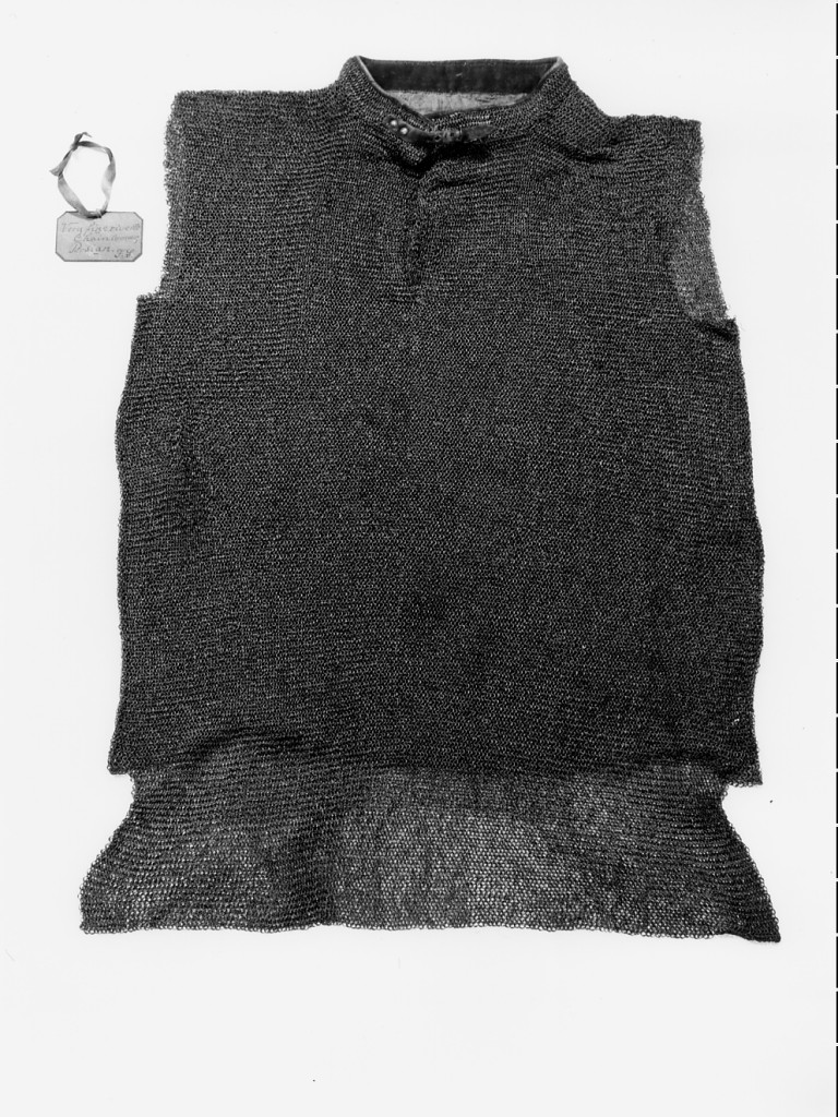 Maglia senza maniche; apertura dietro sul collo e chiusa da fibbia; il dietro è più lungo; bordatura sul davanti. Maglia di ferro a anelli ribattuti a grano d'orzo, con ribattino ingrossato.
