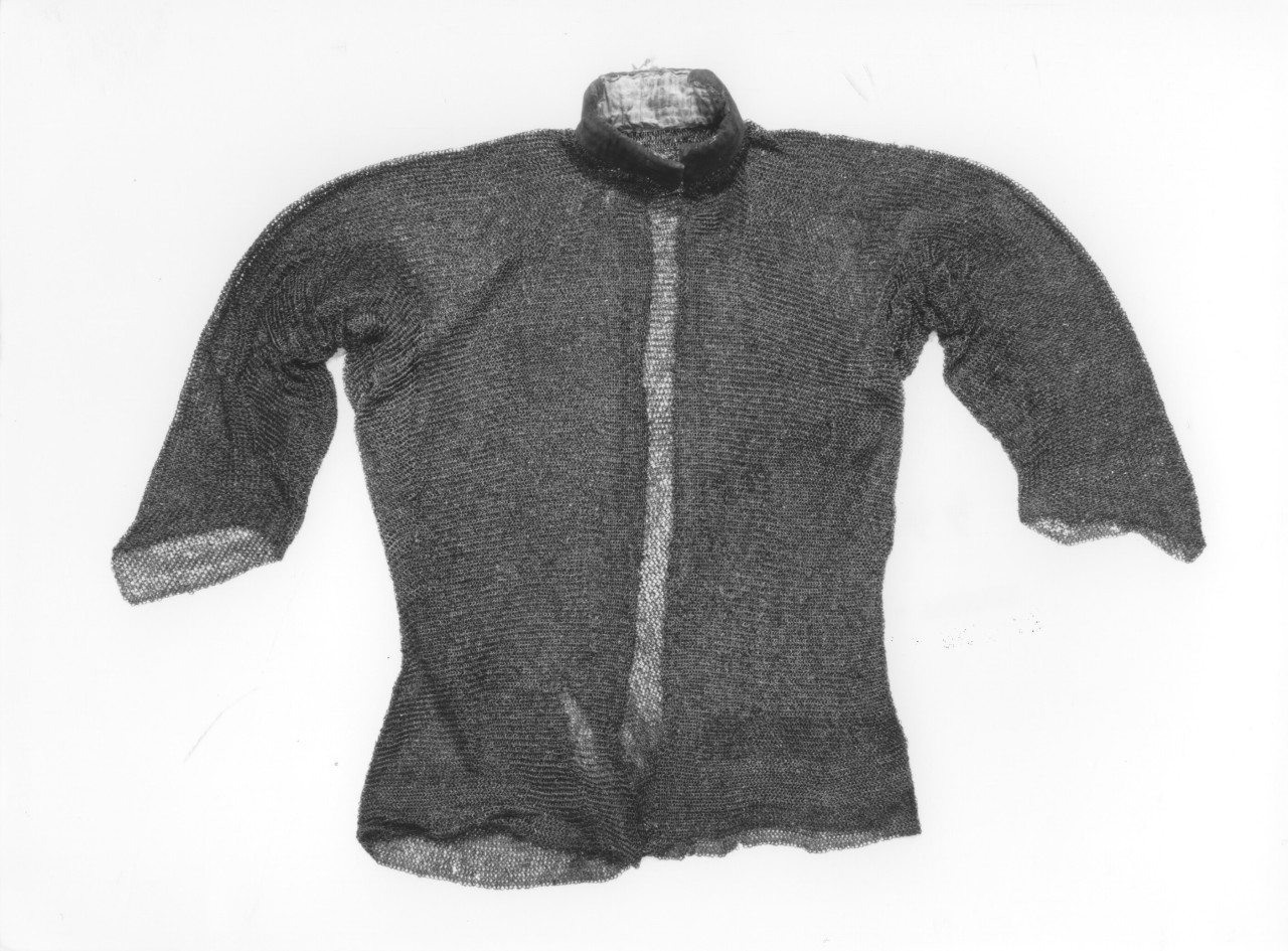 Apertura frontale; due righe nelle bordure; colletto rosso; maglia di ferro a anelli a grano d'orzo aperti, decorata a ganga-janni. E maglia di ottone a anelli a finto grano d'orzo.