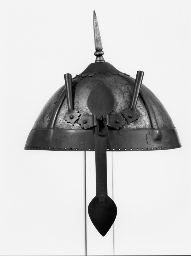 calotta emisferica con rosetta sommitale lobata e festonata dalla quale esce un brocco a sezione quadra terminate a punta. Cerniera con bandellettaa occhio su basettina a fioroni laterlai. Nasale scorrevole chiuso da gocce. Due pennacchiere