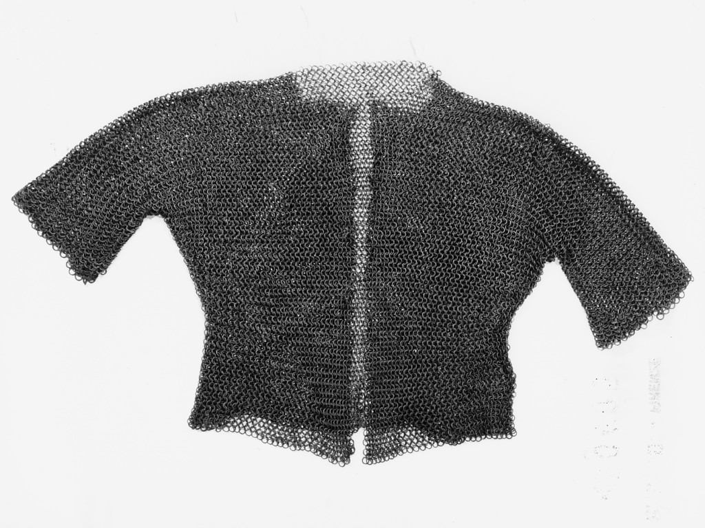 Apertura sul davanti, fesso dietro, maniche a punta; maglia di ferro ad anelli a grano d'orzo aperti e stampati.