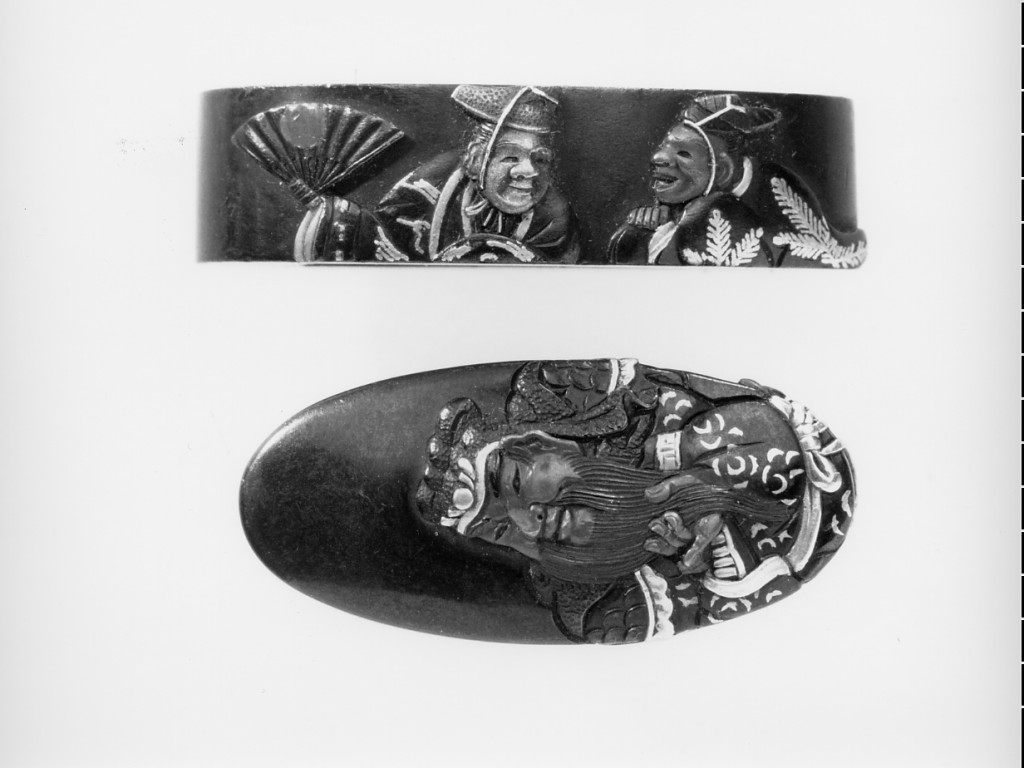 personaggio cinese (cappuccio)/ due personaggi giapponesi, ventaglio (ghiera) (fornimento da impugnatura - kodogu, serie)