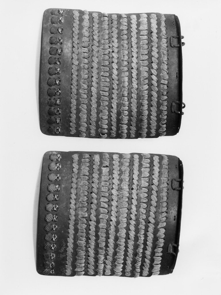 Sei piastre, cinque con lato superiore smerlato, embricate e unite con fettucce, fodera con fiori e farfalle; il bordo della piastra superiore all'articolazione è rilevato. Seta grezza verde, viola,policroma, blu.