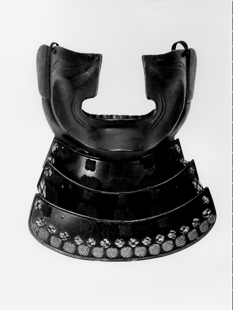 Una piastra anatomica (mancante di naso) e quattro lame; mento inferiore con foro di drenaggio sudore; rughe stilizzate; due ganci a presa per fissaggio naso; seta blu, bianco, rosso, verde.