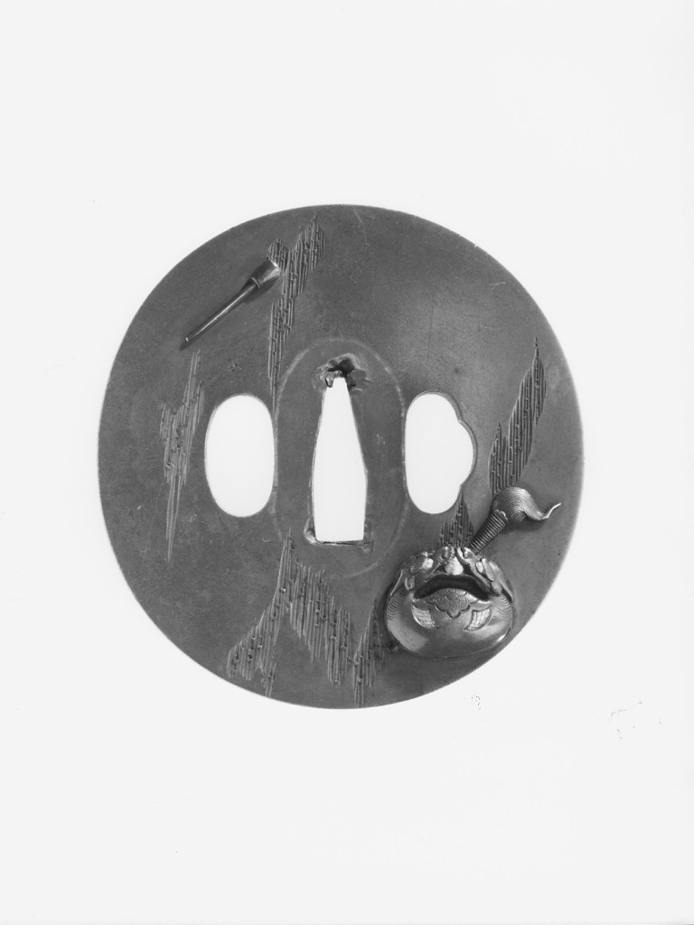 sonaglio, fiaccola, motivi geometrici verticali (recto)/ bastone, motivi geometrici verticali (verso) (guradamano da sciabola - tsuba ovoidale, elemento d'insieme)