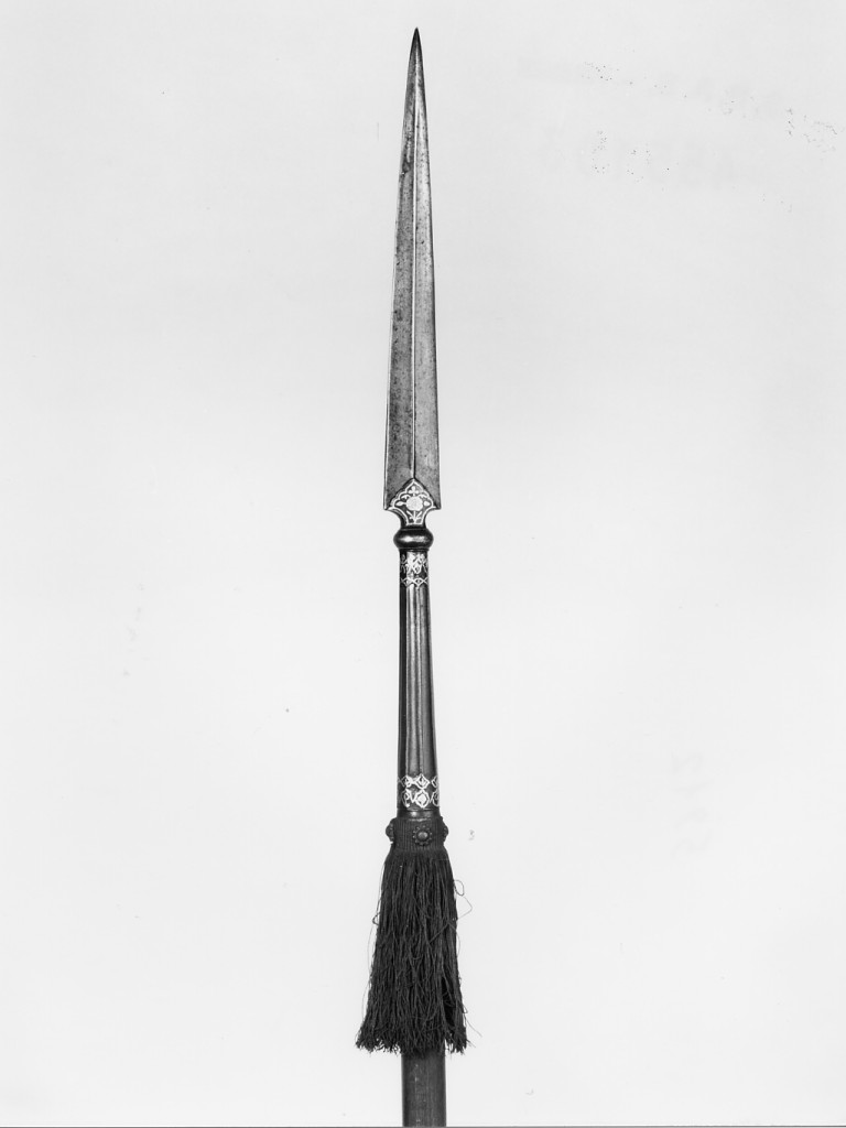 acciaio/ damaschinatura/ brunitura/ punzonatura/ intaglio/ doratura a fuoco/ agemina in oro; ottone/ ritaglio; filo di seta; legno