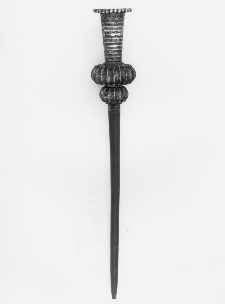 Gorbia tronco-conica svasata e perlinata superiormente, incisa ad anelli sovrapposti, cimata da due sferoidi schiacciati sovrapposti spicchiettati.Da lì si diparte una puntazza a sezione circolare decrescente fino alla punta ribattuta. Probabile calzuolo di sang.