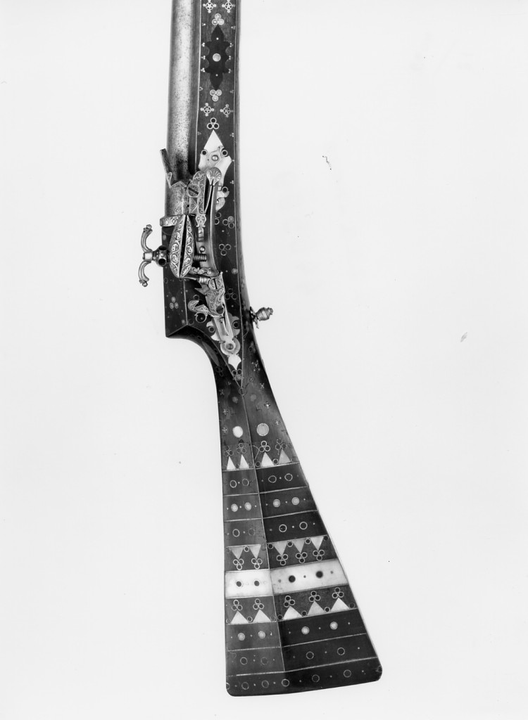 Fucile alla 'berbera'; a un terzo della canna decorazioni stilizzate; cassa e calcio intarsiati a motivi geometrici.