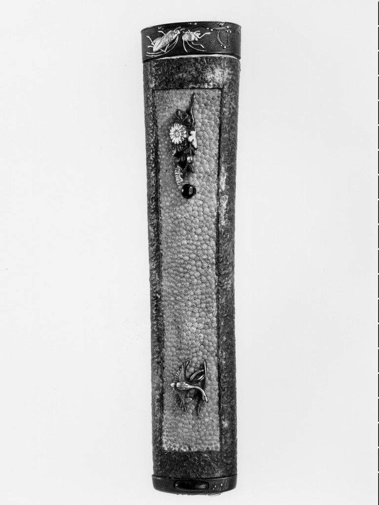 legno di magnolia; pelle di pesce (razza); pelle/ laccatura/ doratura; lega di rame/ incisione a uova di pesce/ sbalzo/ a capello/ incrostazione/ doratura; argento/ incrostazione puntiforme; rame/ incrostazione/ incisione/ doratura/ argentatura