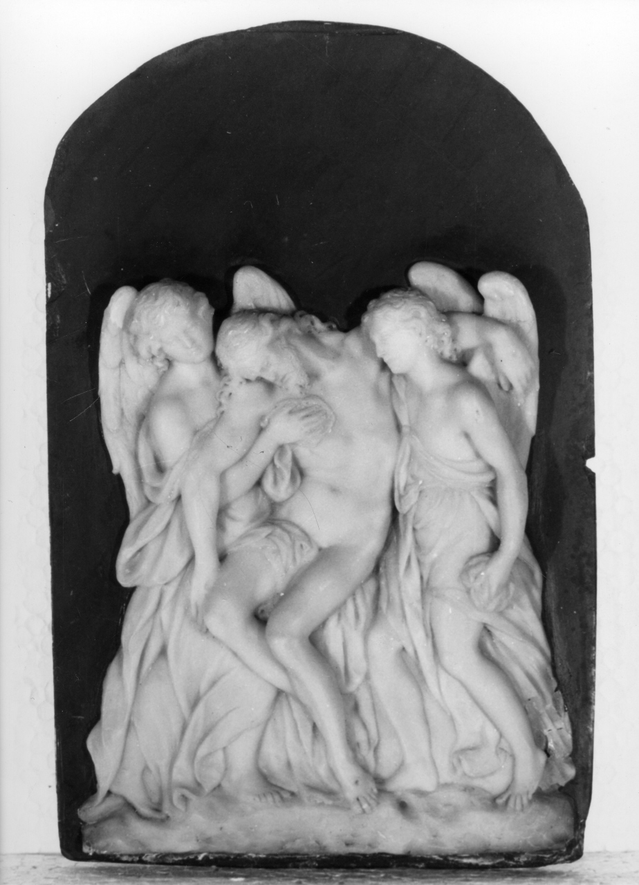 Rilievo in cera giallastra raffigurante Cristo morto sostenuto da due angeli. La composizione delimitata da un arco a tutto sesto è chiuso da cornice in ebano.. Soggetti sacri. Personaggi: Cristo; angeli