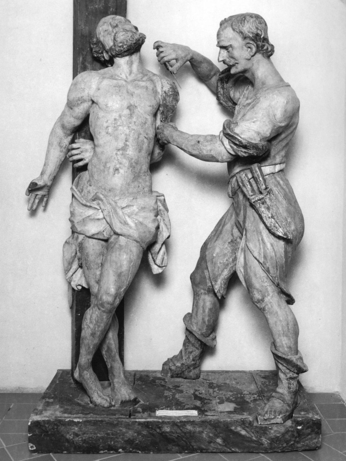flagellazione di Cristo legato ad una colonna con il volto rivolto al cielo; il soldato lo sta flagellando con un coltello