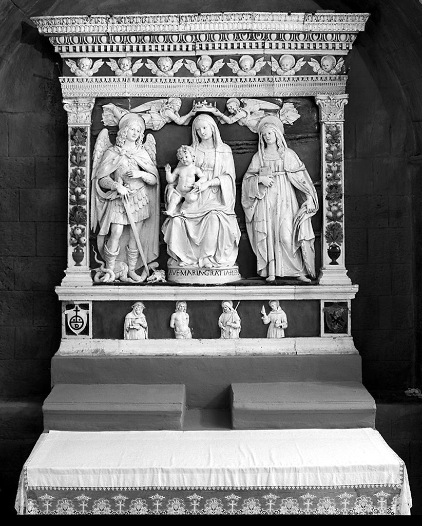 Madonna con Bambino in trono incoronata da angeli tra san Michele Arcangelo e santa Caterina d'Alessandria, san Girolamo, san Sebastiano, san Rocco, sant'Antonio da Padova, cherubini, vasi con tralci vegetali e stemmi.