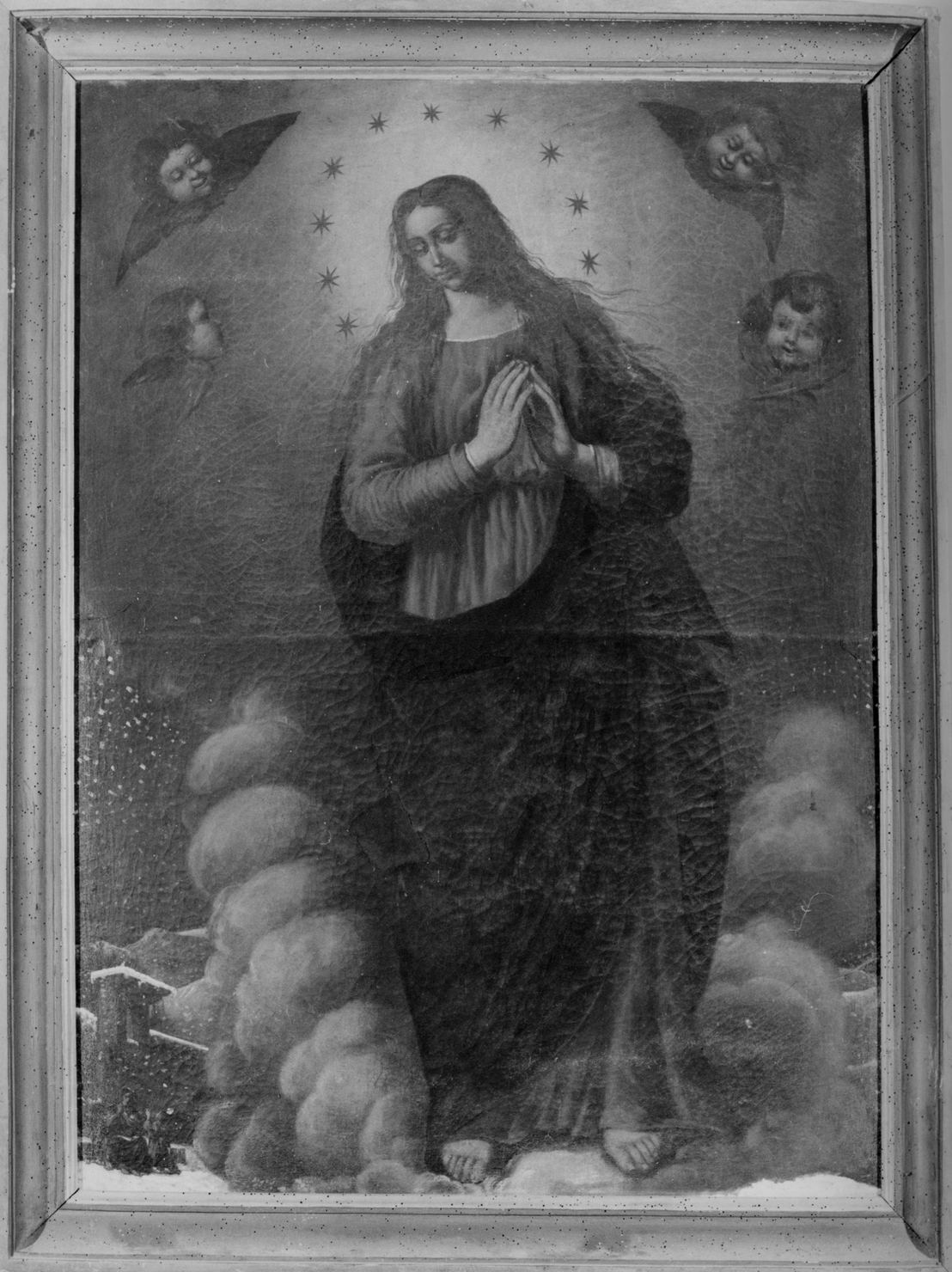 dipinto: di forma rettangolare con cornice dorata e dipinta. personaggi: al centro del dipinto tra nuvole ovattate si colloca la Madonna in posizione eretta, con le mani giunte, lo sguardo rivolto in basso e i capelli sciolti ricadenti sulle spalle; intorno al nimbo luminoso delimitato da stelline si dispongono quattro testine angeliche; sfondo: si distinguono rilievi, edifici innevati e due piccole figure.