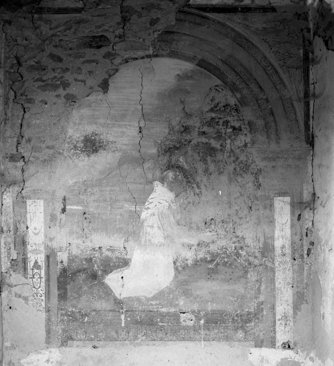 dipinto centinato. santo benedettino genuflesso davanti al crocifisso; sullo sfondo si erge un monte sul quale è posta la croce; sulla destra spezzoni di tronchi d'albero e di fogliame; un arco a tutto sesto con cornici retto da due colonne racchiude la scena; in basso cornice con testine angeliche.