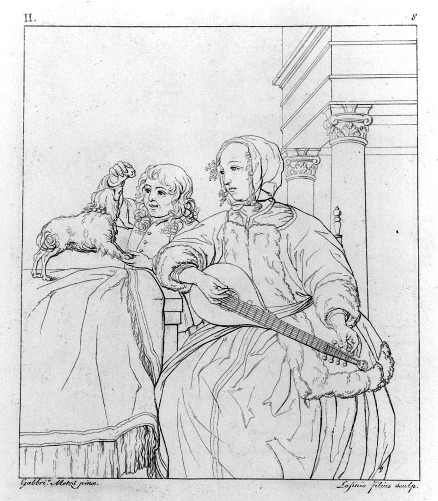 figura femminile che accorda un mandolino (stampa, elemento d'insieme)