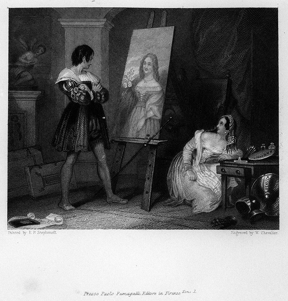 pittore ritrae una giovane donna (stampa, elemento d'insieme)
