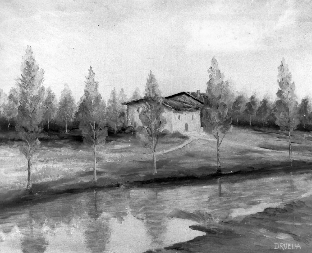 Le rive del fiume Po, con un filare di pioppi e un casolare.
