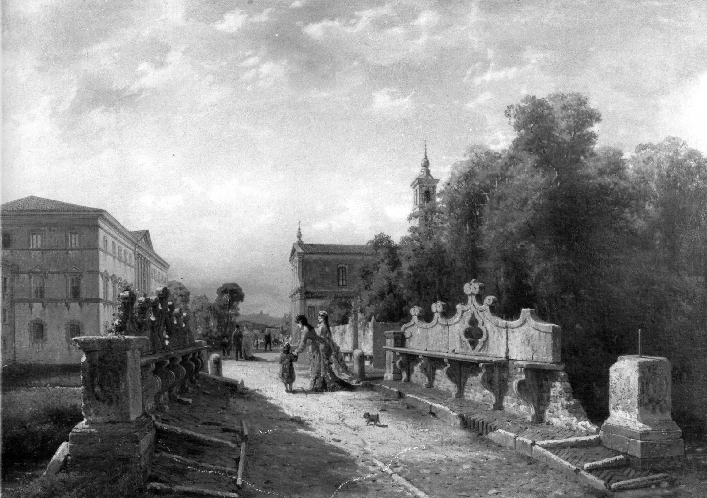 Due signore in abiti ottocenteschi a passeggio con un bambino lungo una strada. La strada passa davanti ad una villa e ad una chiesa; in primo piano, ai due lati della strada, dei sedili in pietra diroccati. Sullo sfondo, davanti alla chiesa e alla villa, persone a passeggio.