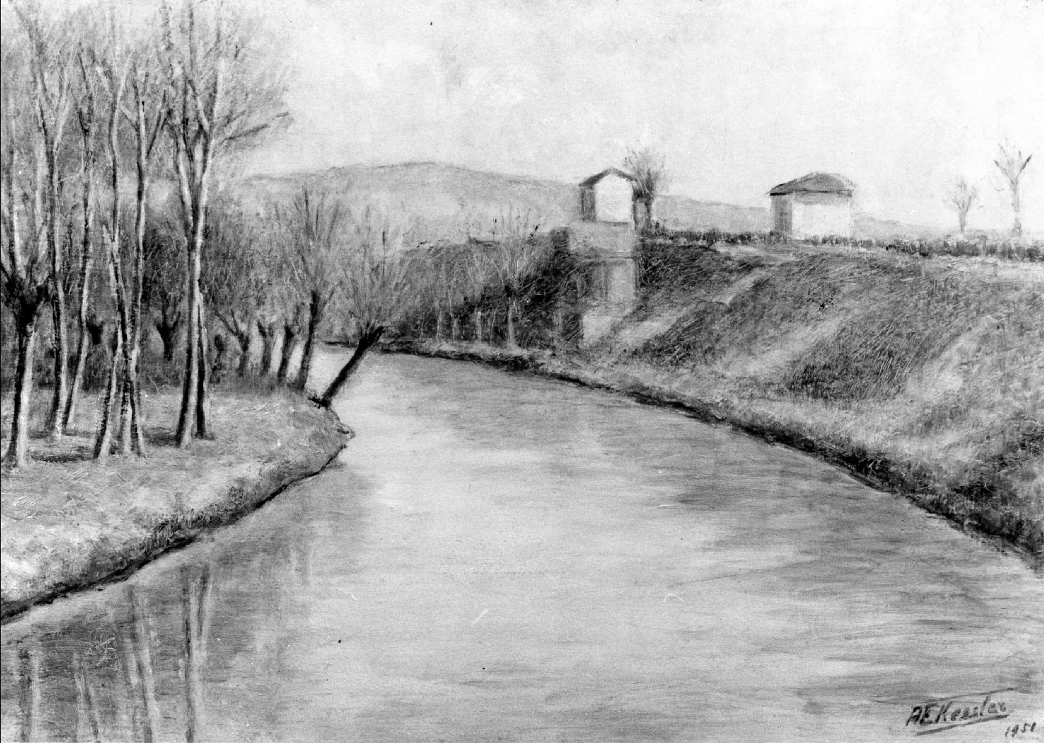 Paesaggio fluviale col fiume Adige e due casette sull'argine.