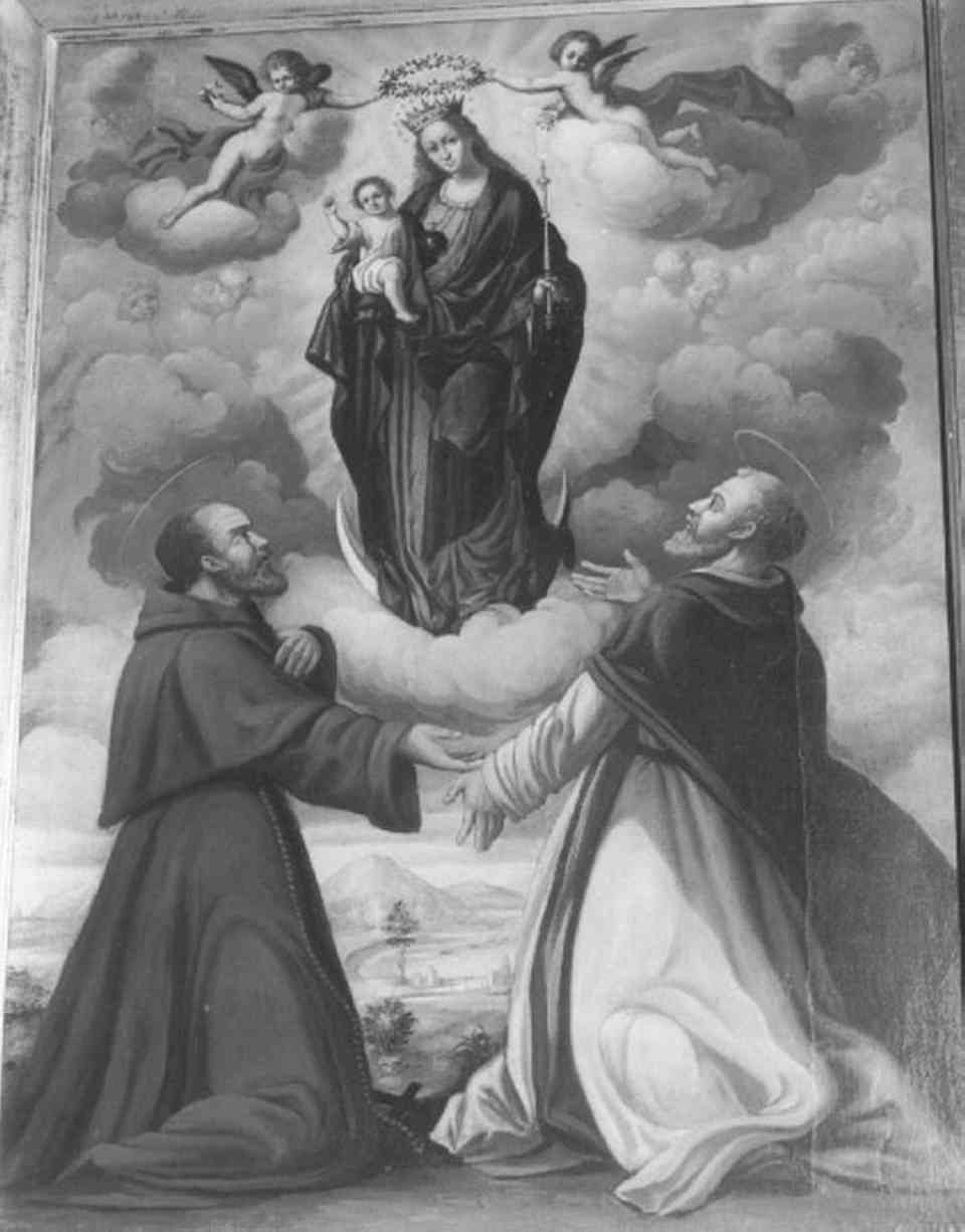 Personaggi: Madonna; Gesu' Bambino; San Francesco d'Assisi; San Domenico. Oggetti: corona; scettro; globo crucifero. Figure: angeli; cherubini. Architetture: paesaggio. Vegetali: piante