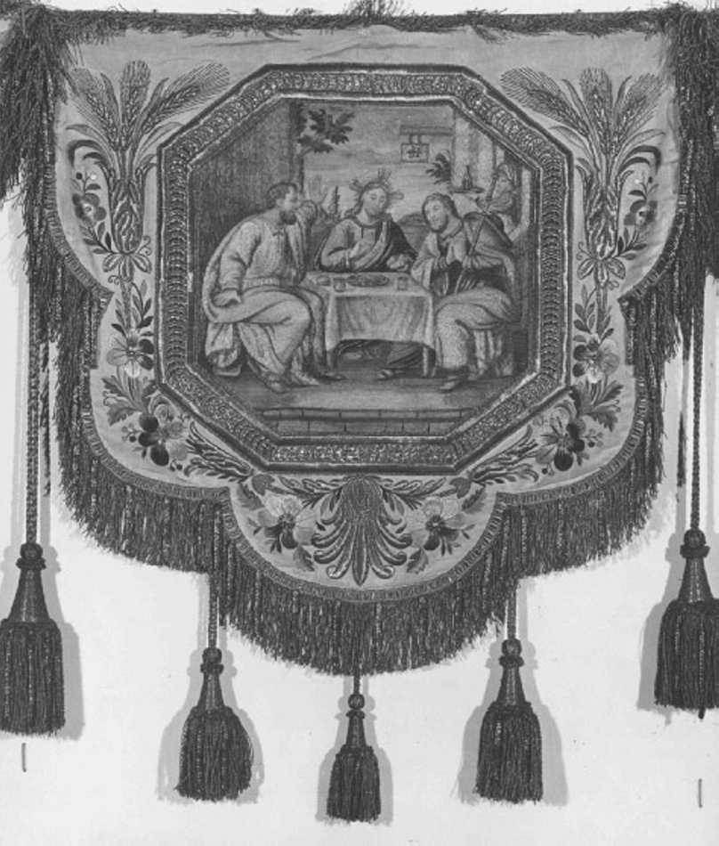 Decorazione a stampo e ricamo con raffigurata la cena in Emmaus: Cristo ha un manto azzurro e tunica rossa. Il discepolo a sinistra ha una tunica avorio e manto rosso. Il discepolo a destra: tunica verde, manto gialo. Cornice a fiori rosa, gialli, azzurri, foglie verdi, spighe dorate.