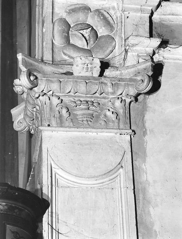 Decorazione: motivi decorativi a foglie d'acanto con fruttiera centrale, a foglie lisce tra i caulicoli