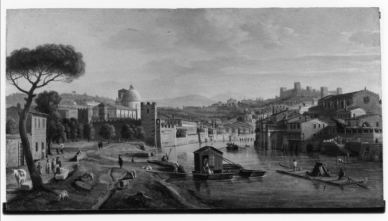 Vista dell'Adige a Verona nei pressi della chiesa di San Giorgio; lungo il fiume imbarcazioni e sulla riva diversi personaggi e animali. Sullo sfondo le colline con il castello di San Pietro.