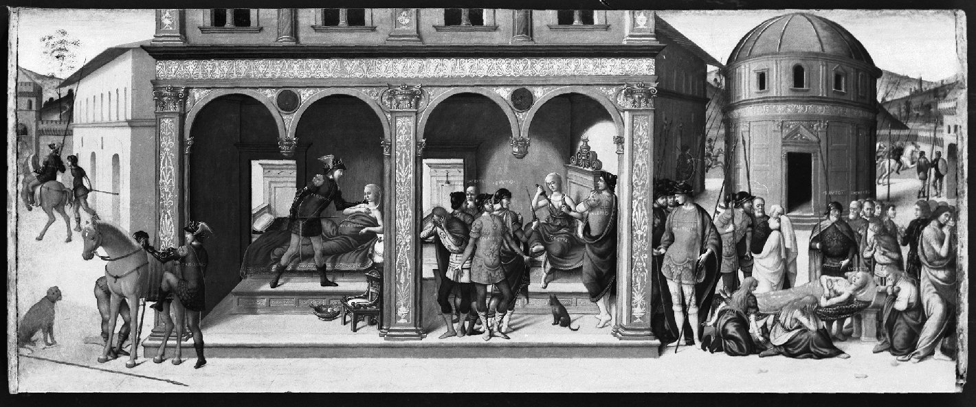 Fronte di cassone nuziale. Soggetto ambientato in paesaggio cittadino, scandito da costruzione architettonica a loggia.. Soggetti profani: Oltraggio a Lucrezia di Sesto Tarquinio; Suicidio di Lucrezia; Funerali di Lucrezia