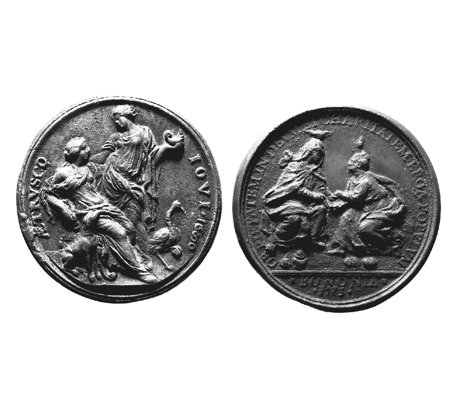Verso della medaglia.. Allegorie-simboli: donna seduta con un cane accanto (Fedeltà) presso una donna ritta con lampada e gru (Vigilanza)