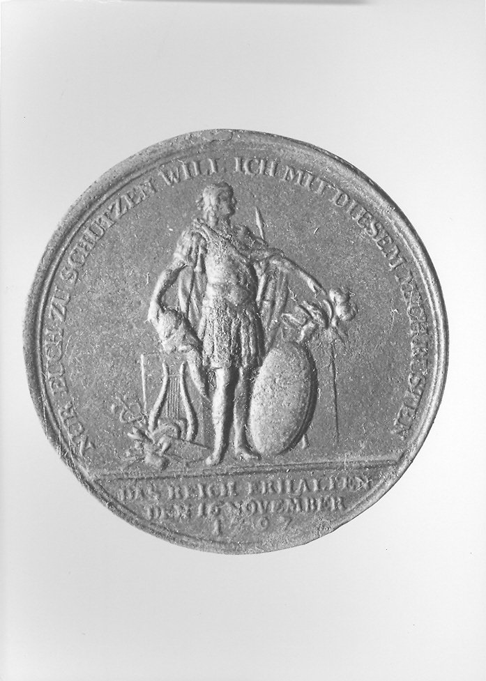 Medaglia di forma circolare raffigurante soldato stante con armatura. Scudo ai suoi piedi; elmo nella mano destra.