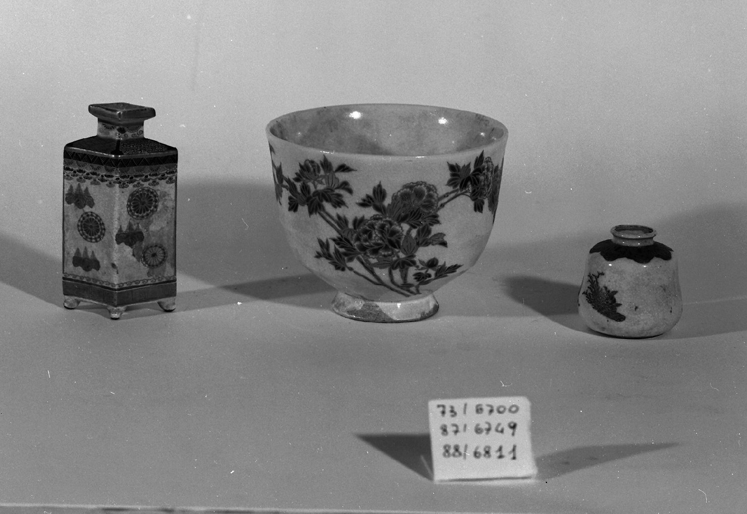 Vasetto a sezione romboidale dal corpo in ceramica ricoperta da un'invetriatura craquelure color crema. Poggia su quattro piedini.