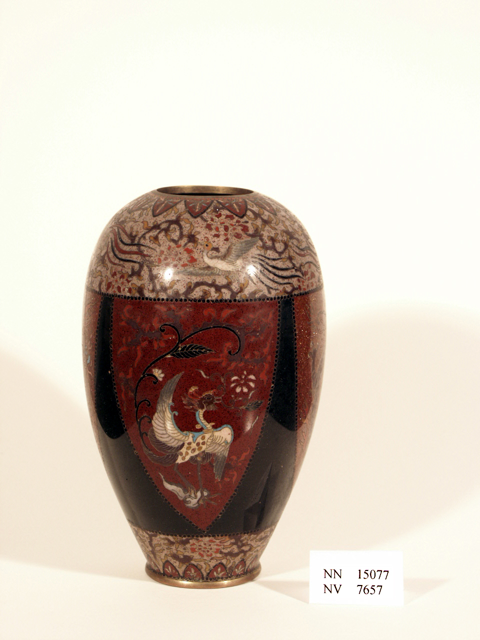Vaso privo di collo decorato con quattro medaglioni a forma di petalo contenenti fenici e draghi su fondo uniforme, fascia superiore decorata con fenici e motivi floreali. Invetriatura e avventurina.