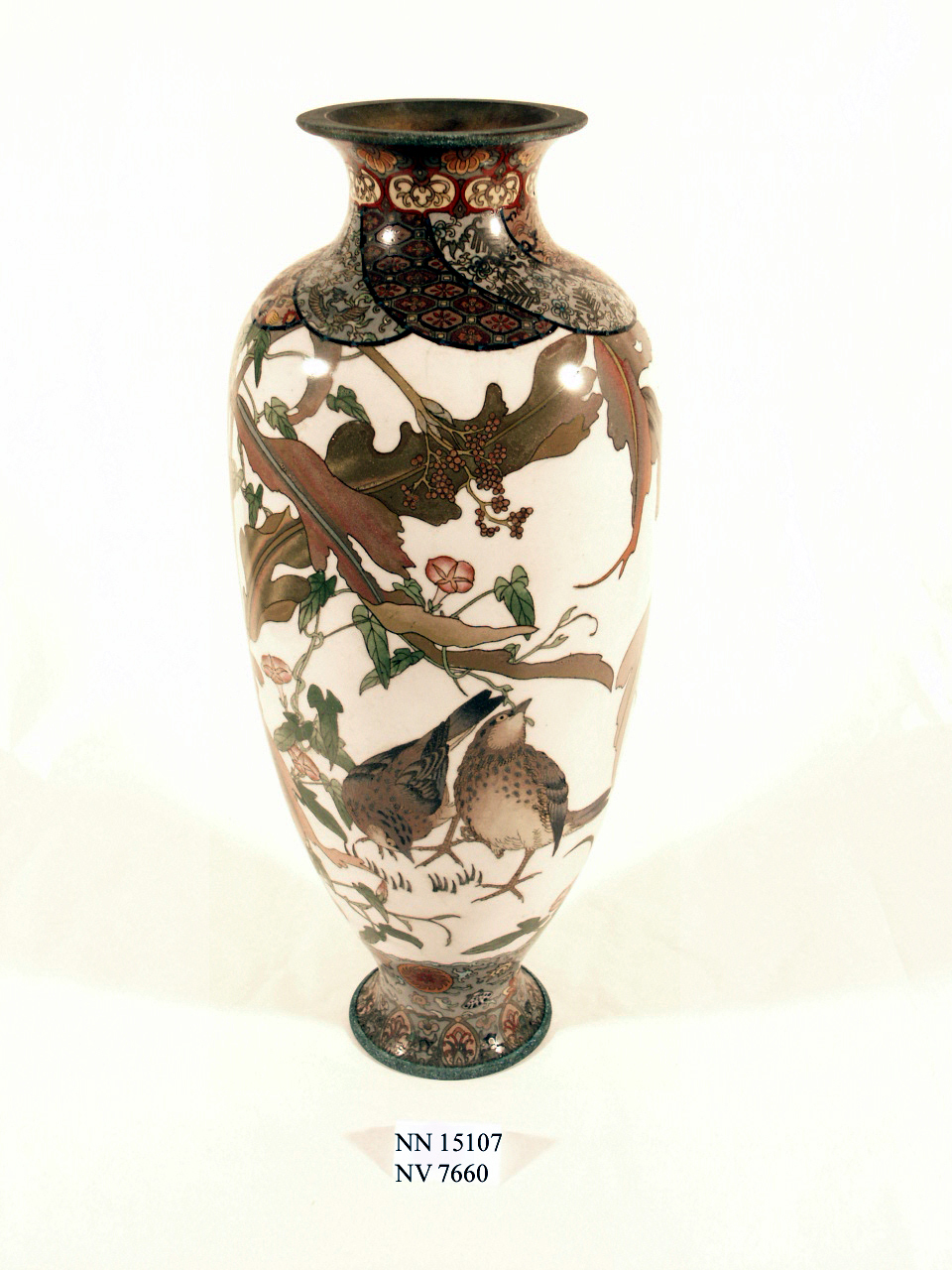 Vaso con corpo ovale con bocca e piede svasati. Decorazione collo: motivi floreali, scomparti a forma di petalo con draghi, karakusa (arabeschi), shippo (cerchi intrecciati) con karabana (fiore), motivi marini. Decorazione corpo: uccelli, rami fioriti. Becorazione base: motivi marini (conchiglie). Interno non smaltato.