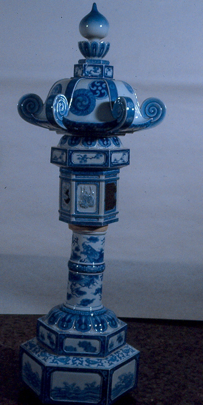 Lanterna decorativa (toro) composta da sei parti ad incastro: pomello, calotta, corpo esagonale, fusto e base. Una piccola finestra è assicurata sulla parte esagonale del corpo. Diffuse sbeccature della coperta.