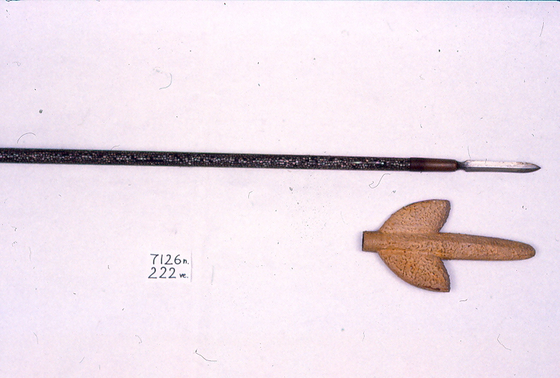 Lama di tipo yari ryoshinogi, asta interamente rivestita di madreperla a pezzi piuttosto grandi e regolari ed inclusione di striscioline rettangolari, fodero a forma di foglia in lacca giallo-ocra corrugata (ijiijinuri).