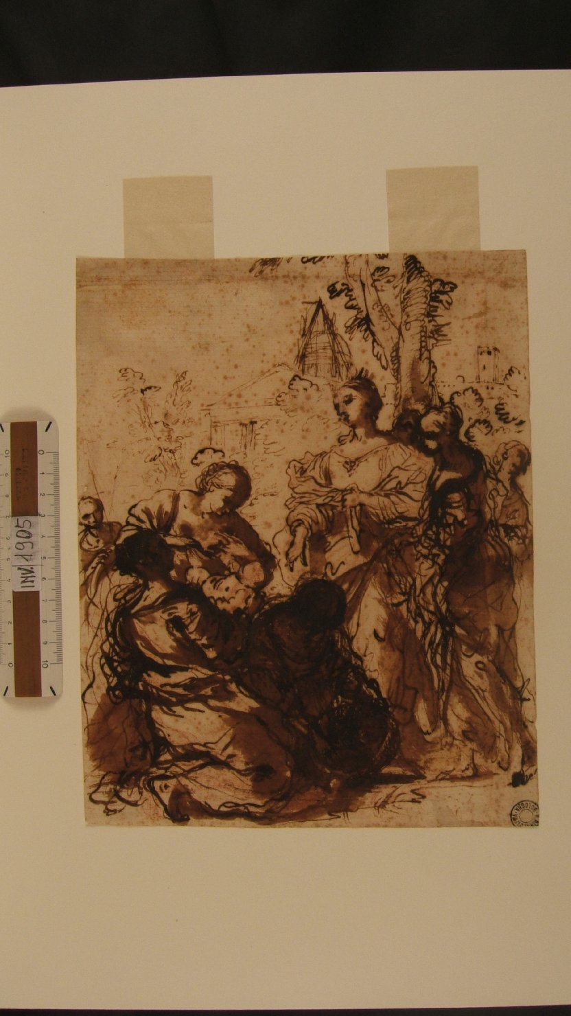 A penna, inchiostro metallo-gallico e bistro, pennello e bistro diluito, tracce di matita rossa e di biacca su carta fortemente ingiallita e maculata, rappresenta il ritrovamento di Mosè.