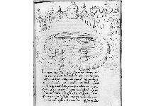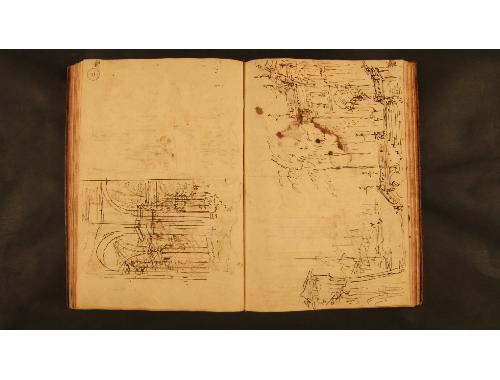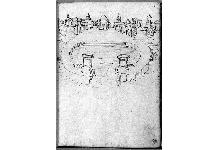 Il disegno rappresenta un ampio porto di mare con torre e palazzo (r.); una colonna e la parte superiore del disegno successivo a destra, una pianta di scena con ornamento del pavimento (v.).