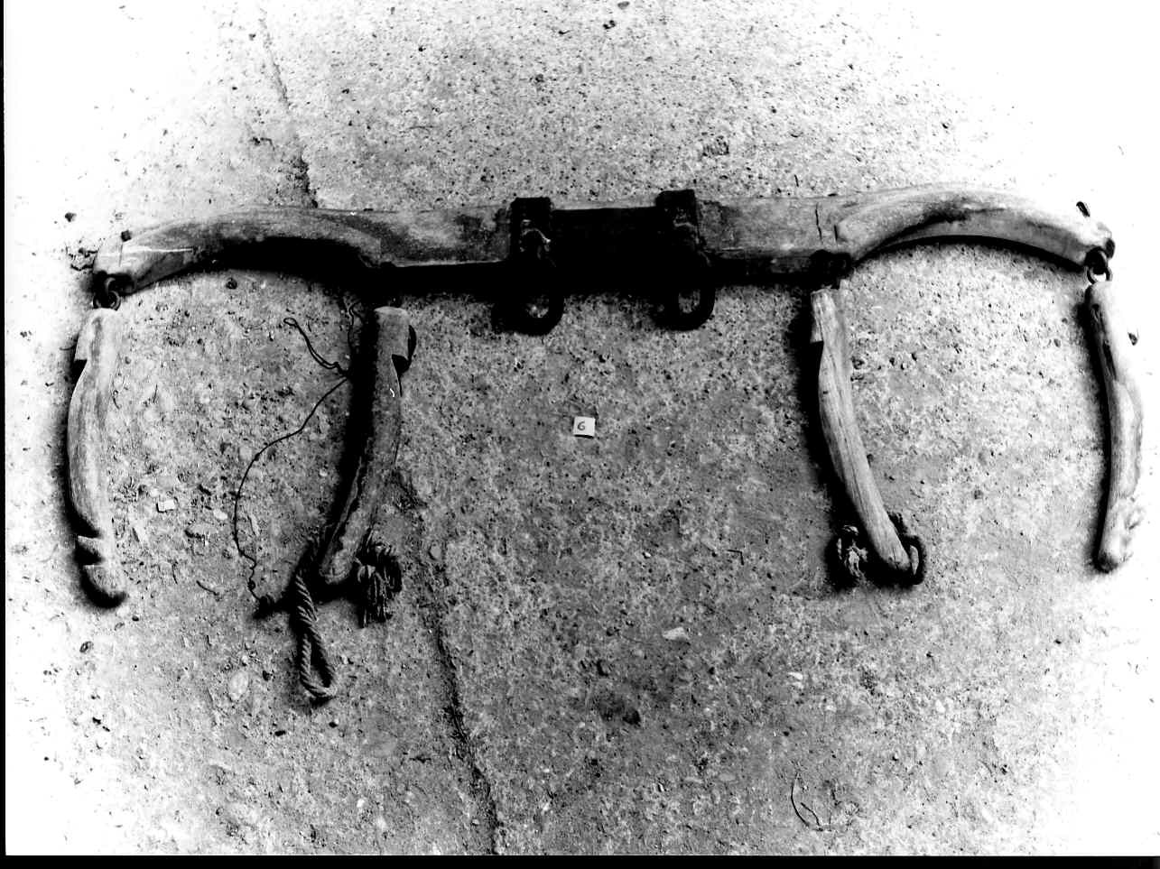 E' costituito da un'asse di legno arcuata alle due estremià, mentre al centro, orizzontale e robusto, è applicato un rinforzo di ferro con due anelli per il collegamento con il timone dell'aratro. Alle estremità arcuate sono inseriti gli elementi dei collari, semicircolari, sagomati per fissare i finimenti in cuoio e corda