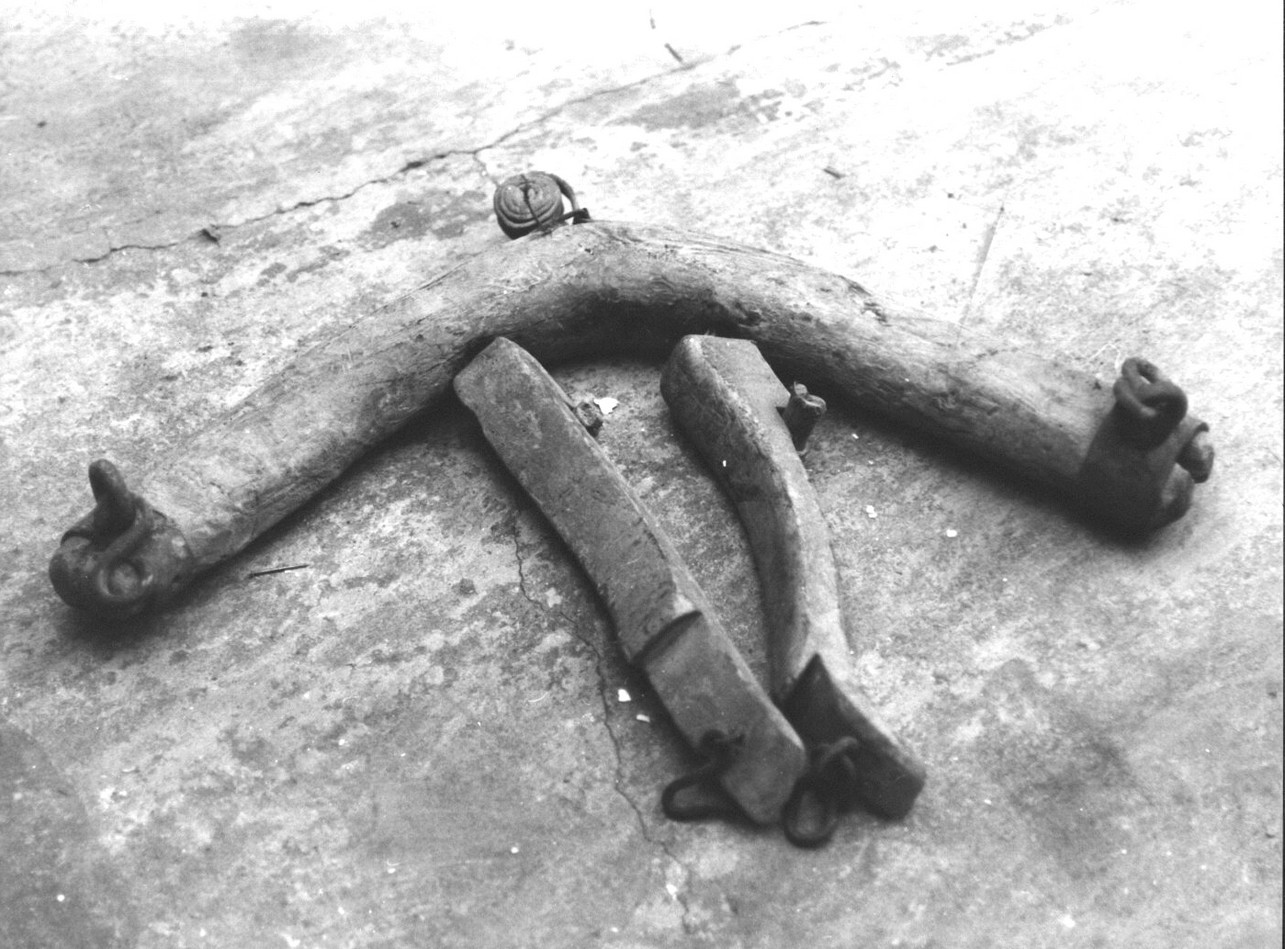 Il giogo, in legno di orno, ha una curvatura accentuata e continua che forma quasi una gobba al vertice. Gli estremi sono rinforzati da una fasciatura in ferro, cui sono fissati due anelli. Al colmo quasi della curvatura pendono invece e parelle