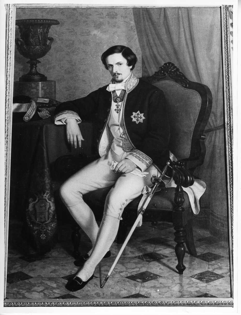 dipinto. Personaggi: Carlo De Capoa. Oggetti: poltrona; tavola; feluca; libri; anfora; spada; tenda