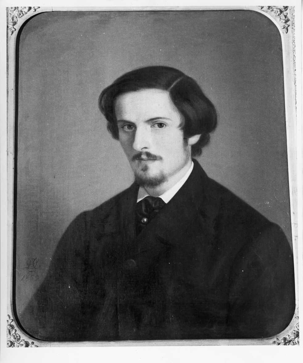 dipinto. Personaggi: Carlo De Capoa. Abbigliamento: giacca enra; colletto bianco; cravatta blu. Oggetti: spillone d'oro