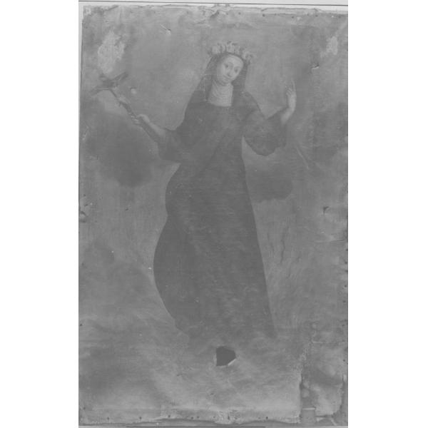 la santa indossa il saio dei terziari francescani e porta sul capo una corona di rose. Nella mano destra stringe il crocifisso mentre con la sinistra indica verso l'alto; ai suoi piedi alte lingue di fuoco lambiscono le sue vesti; sullo sfondo nere nuvole di fumo.